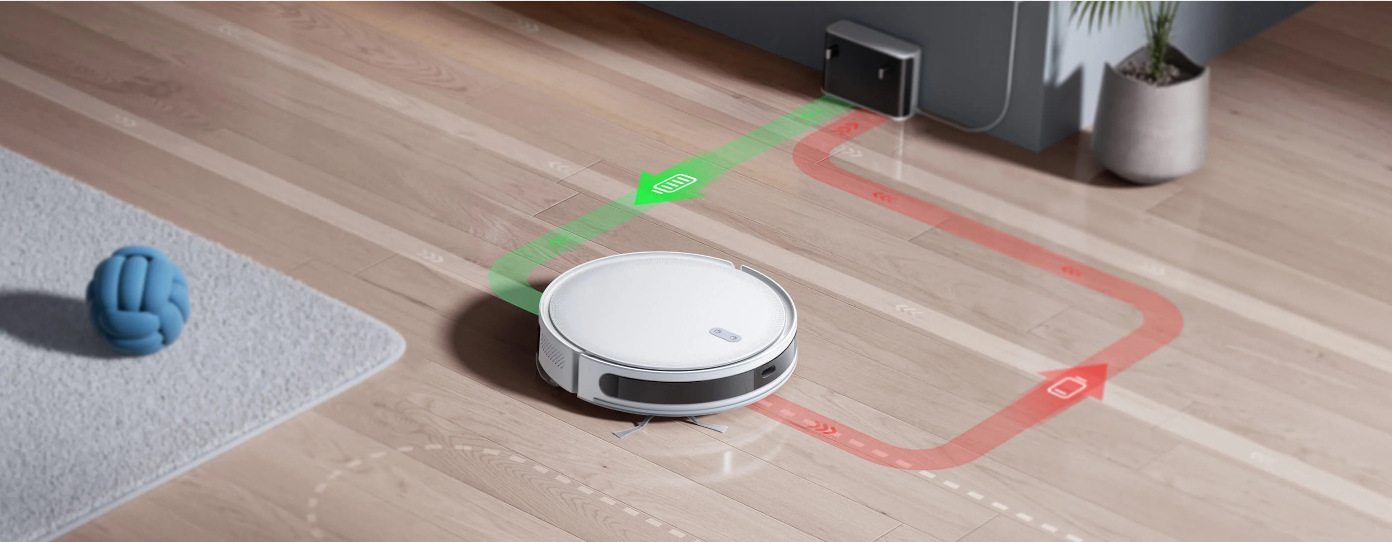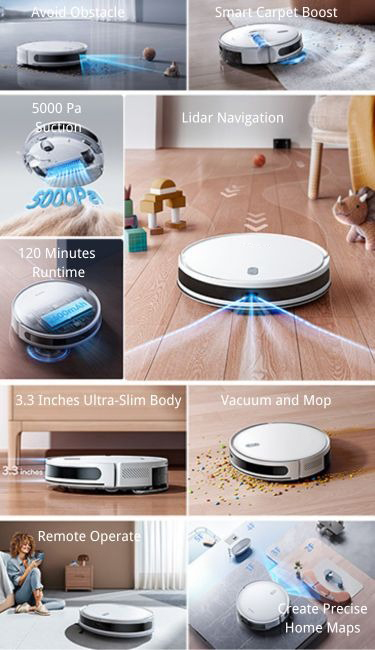 Proporciona hasta 120 minutos de limpieza con una sola carga, se recarga automáticamente cuando la batería está baja y reanuda la limpieza desde donde se detuvo.