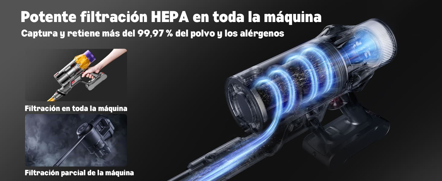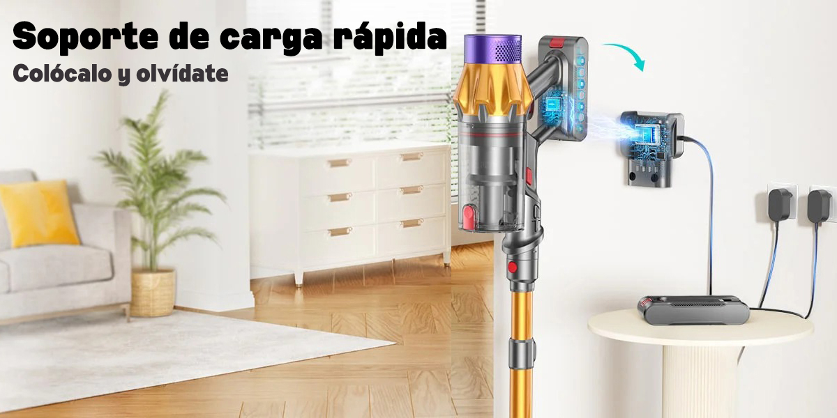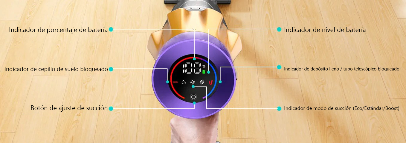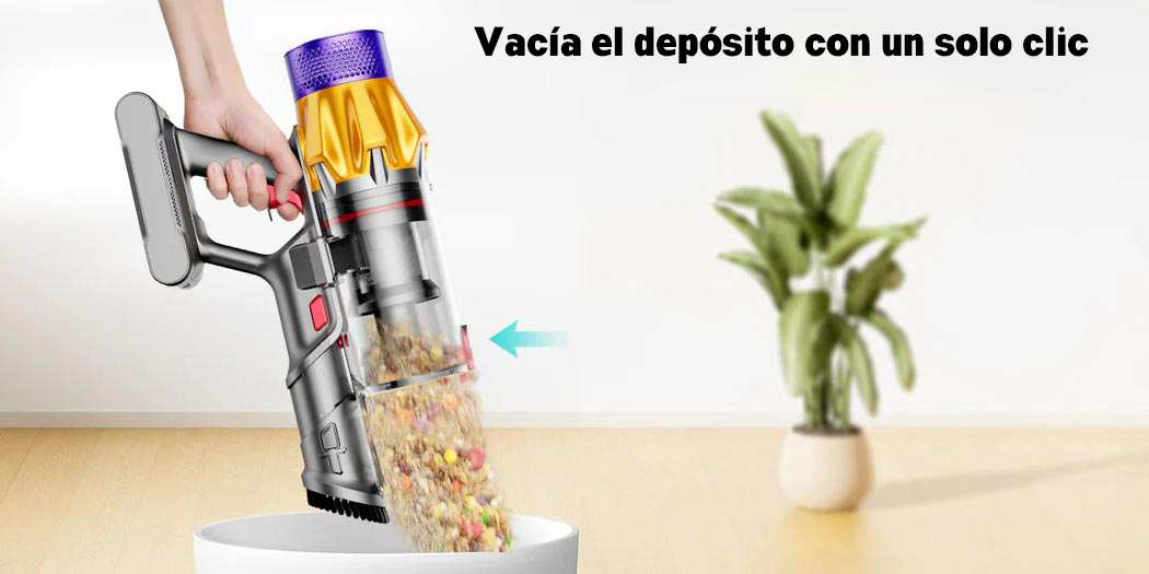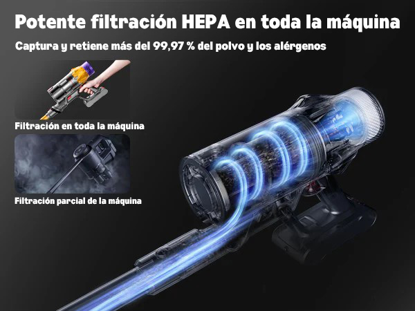 La aspiradora cuenta con una batería de larga duración que permite sesiones de limpieza continuas. Dependiendo del nivel de potencia, puedes disfrutar de varias horas de limpieza con una carga completa, y hasta 30 minutos en modo de máxima potencia.